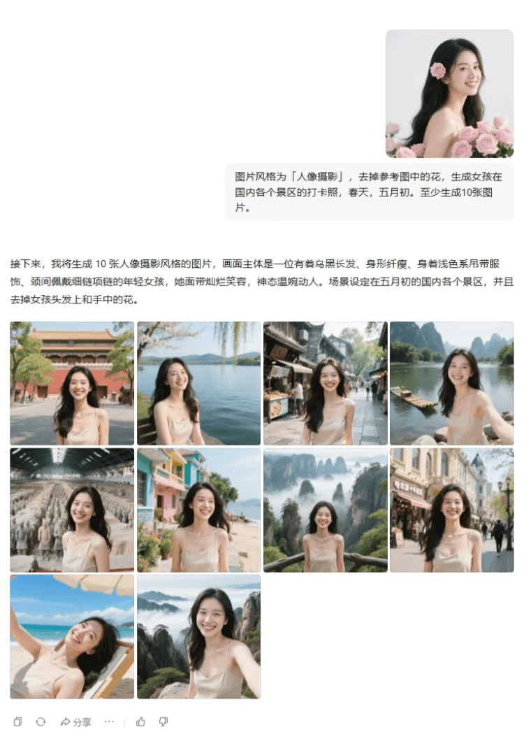 提示词:图片风格为「人像摄影」,去掉参考图中的花,生成女孩在国内各个景区的打卡照,春天,五月初。至少生成10张图片。