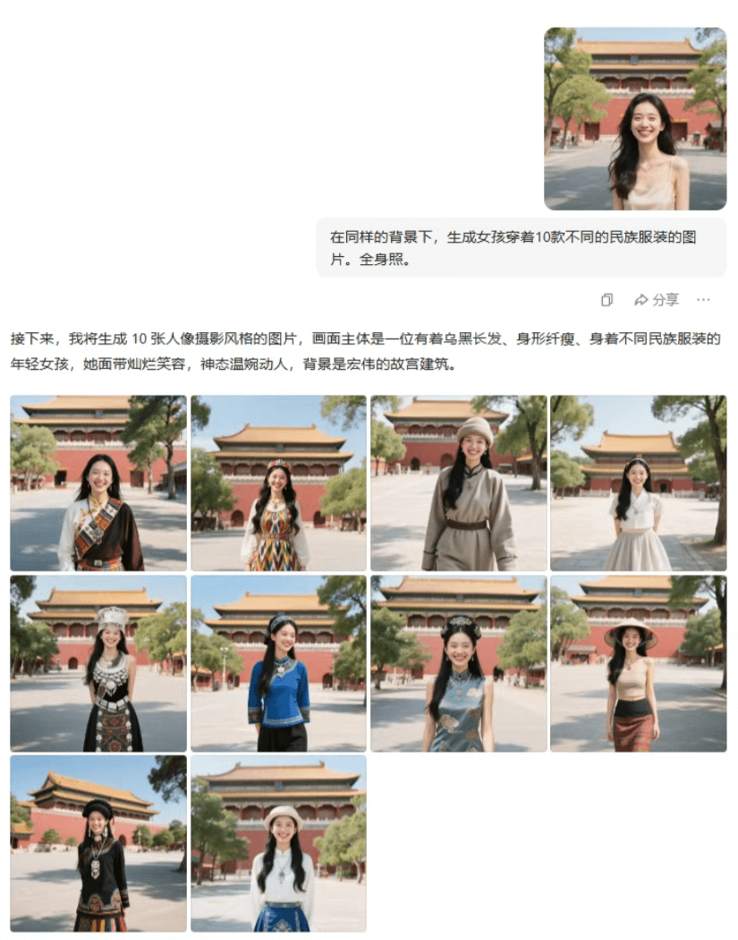 提示词:在同样的背景下,生成女孩穿着10款不同的民族服装的图片。全身照。