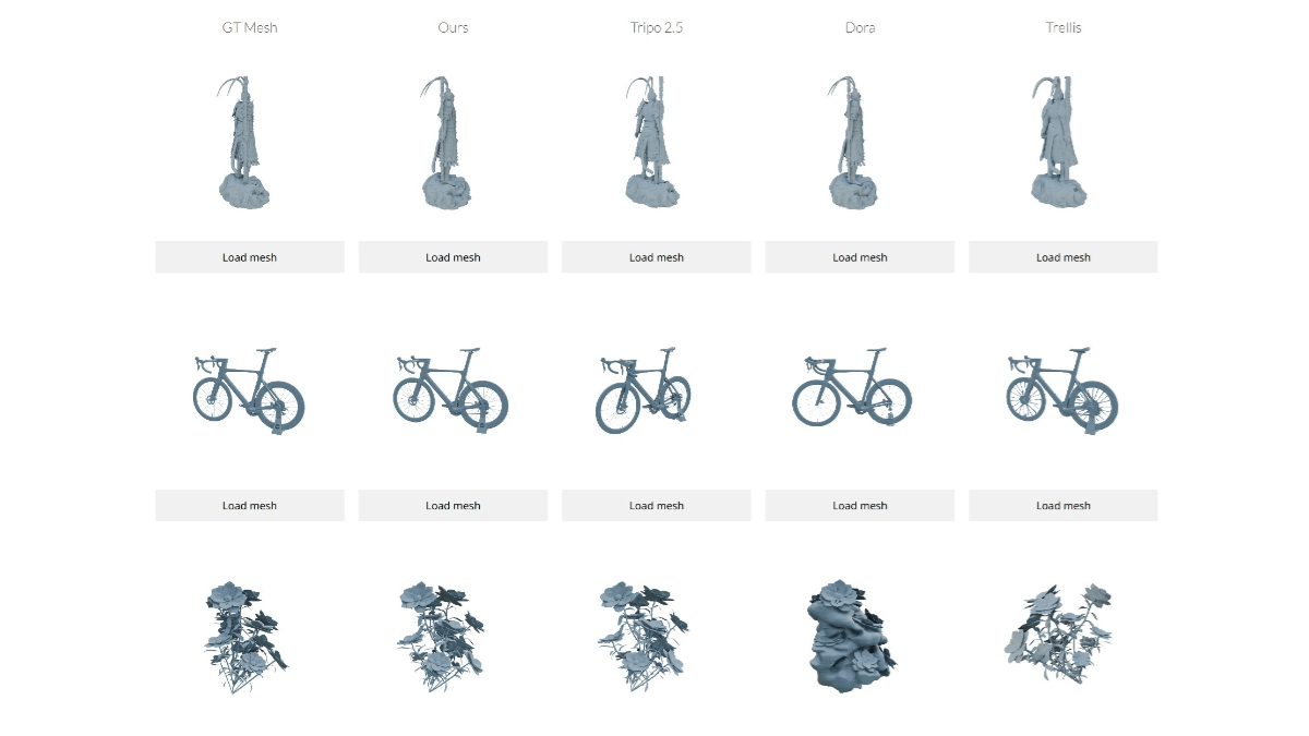 - 细节捕捉能力:传统3D建模方法在细节捕捉上往往力不从心,TripoSF能捕捉精细的表面细节和微观结构。在多个标准基准测试中,TripoSF实现了约82%的Chamfer Distance降低和约88%的F-score提升。